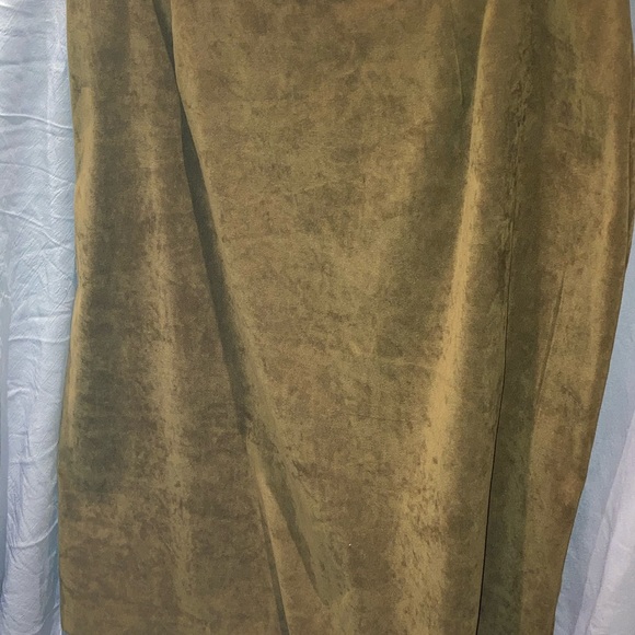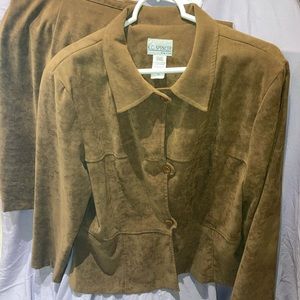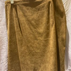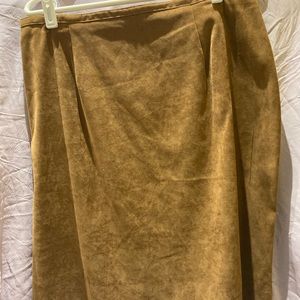 Faux suede brown woman’s skirt suit. Size 16 and it’s a rear zipper skirt with a 24 inch length with 3 inch side splits on both sides. Part of full suit.