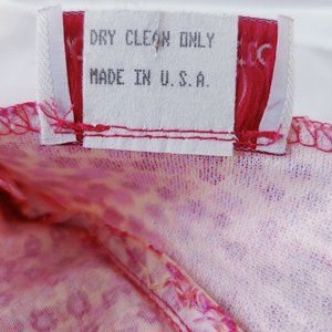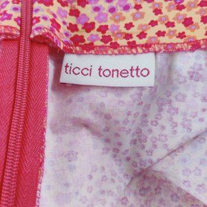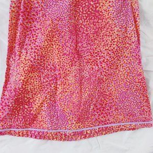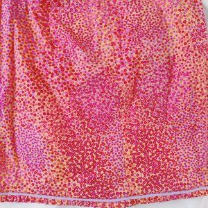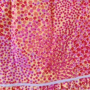 Orange, red and pink, lavender mini floral skirt. Light weight. 97 cotton, 3 lycra. Made in USA. Nice pleat and ribbon detail to bottom of skirt. About a 28 inch waist and 18 inches long. Narrow hip. Size small. Very good condition, slightly used.