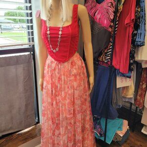 Skirt with beautiful blush flowers and tool underneath with a trim that gives it should. runs big with zipper up the back.