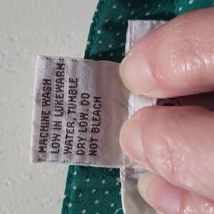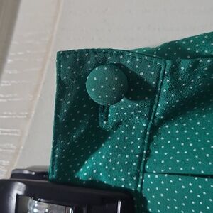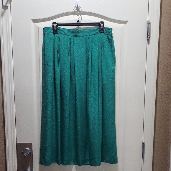 Womens size 14 pleated dress skirt. Kelly green with white pindots. Single button closure in matching fabric at top left side of waistband. Hidden pocket on each side of skirt that blend in with the pleats. Skirt is approx 32 1/2" long. Has elastic on back waistband although it has lost a lot of it stretchiness. Could probably be easily replaced or if you don't need the elastic in it like me, then it functions just as a solid waistband. No stains, snags or tears.
