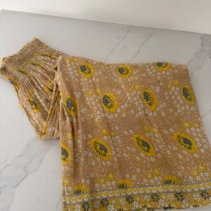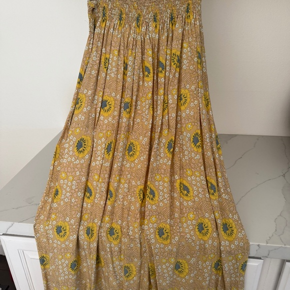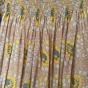 Cotton blend easy pull on skirt with elastic waist. One size. The pattern is a soft gold with teal & cream flowers