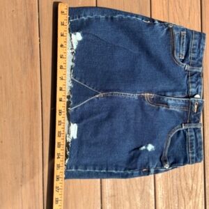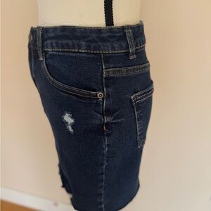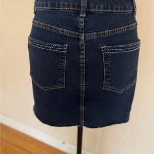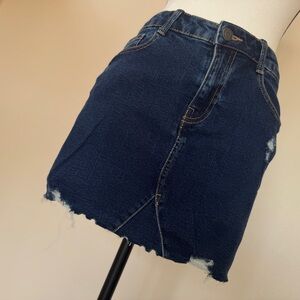 Stylish dark blue denim mini skirt with distressed details. Perfect for casual outings.