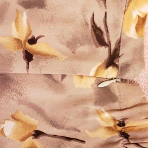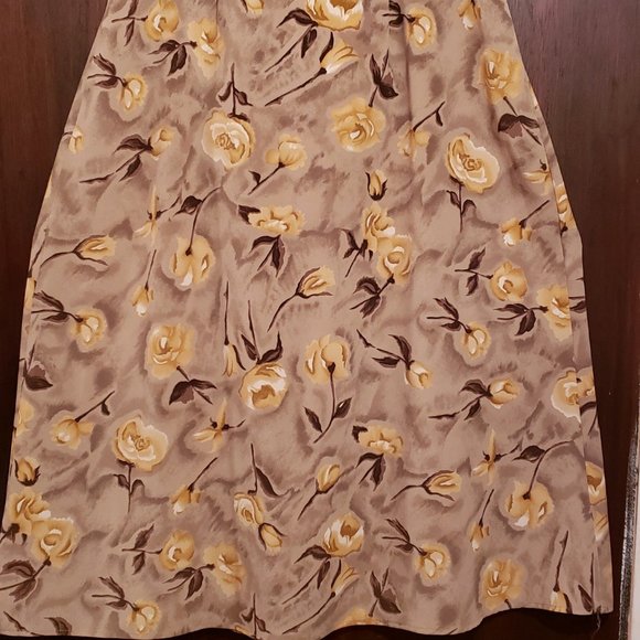 This wonderful floral skirt is unique and gorgeous. The skirt has a hidden side zipper with an elastic back for complete comfort.The background has shades of tans and beige. It is adorned with lovely roses and is an A-line style.