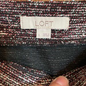 Cute ruffle front, pencil skirt, elastic waist, 19". Stylish mutli-color blend. LOFT. Polyester/cotton blend. Machine wash, tumble dry. In excellent condition.
