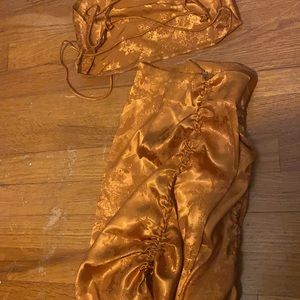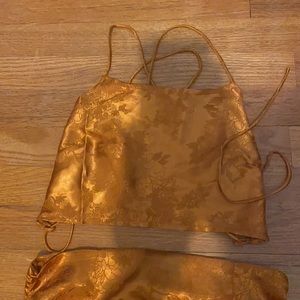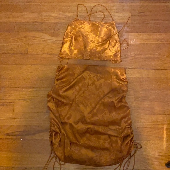 Bronze-y/ Gold skirt set, skirt has a zipper and adjustable side length. Top is adjustable due to straps in the back