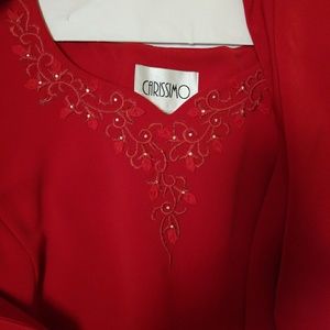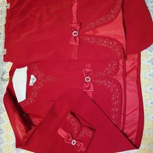 Red with silk trimming. "Skirt is a size smaller than Coat and Vest. " Its Altered''