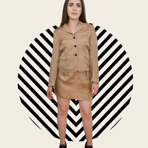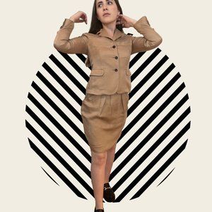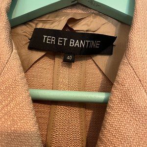 A skirt and blazer set made of huckaback linen fabric, exquisitely finished on the inside, from the TER ET BANTINE brand, crafted in Italy. The set features button details on the sleeves and an elastic waistband on the skirt. It embodies elegance and high-quality craftsmanship, with the huckaback linen fabric providing durability and breathability. The attention to detail and fine finishing on the inside highlight the brand's commitment to excellence. The button accents on the sleeves add a classic touch, while the elastic waistband on the skirt ensures comfort and flexibility. Ideal for a sophisticated and stylish ensemble.