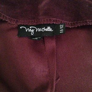 Wine color mid length short velvet skirt with 4" slit cut out side front. Lightweight. Back zipper. A bit of stretch to the fabric.