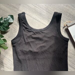 This sleek black ribbed tank top offers a comfortable and stylish fit, perfect for any casual occasion. Conveniently has a built in sports bra.