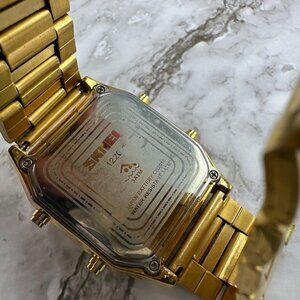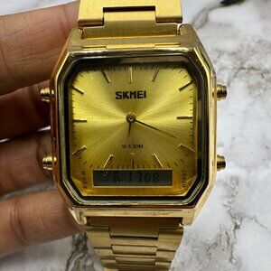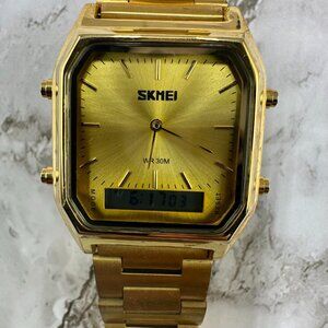 Skmei Watch Men Gold Tone Digital Analog Square Dial 34MM New Battery 8.25 Inch