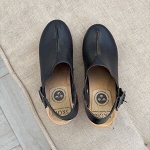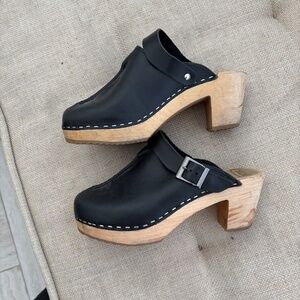 Skola Organic Comfort Footwear Clogs. Handmade in Sweden. Black vegetable tanned leather upper, tan wooden soles. Moderate heel height. Strap detail with silver buckle can be worn around the heel or be pushed up to the upper part of the clog. Seam detail down the top of the clog upper. Slight signs of wear; otherwise, in great condition and ready for the cooler months.