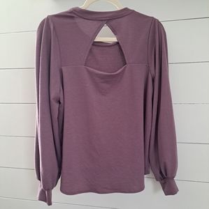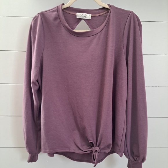 Soft purple, long sleeve top. The sleeves are loose with tight cuffs for a pretty flow. Tie in the front, but it looks way cute tucked into pants as well. Small cutout detail in the back. Fits true to size large. Lightly worn, without tears or stains.