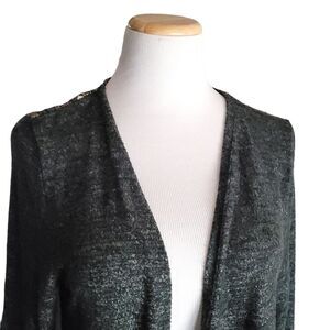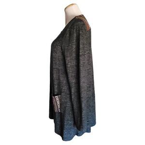 Fuzzy Fibers, Dark Gray open front light knit sweater w/tribal or tapestry cloth accents at shoulder and pockets