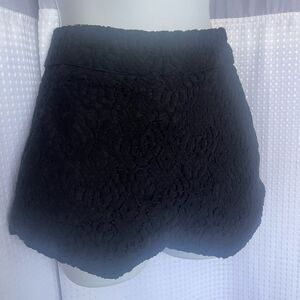 Skort Short Skirt with Lace Overlay Mini Skirt. This skirt is super cute, but subtle with lots of detail. Super versatile and comfortable. 14 inches laying flat at the waist, 12 inches long