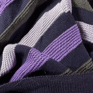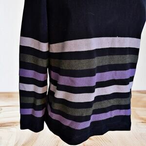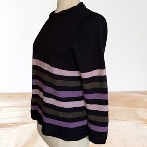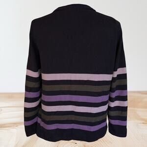 Description: Striped Sweater in Black with Stripes in soft colors of Purple, Olive and Tan.