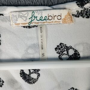 Freebird women’s blouse in size small. White semi sheer top with allover skull print, long sleeves, and tie front hem. Lightweight fabric with a gothic punk style. Unworn, no tags, no flaws, gift quality. Ships next business day.
