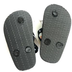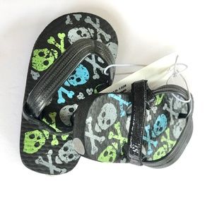 Adorable skull and bones flip flops. Back strap to keep them on little one's feet. Black with gray, green and blue design. NWT.