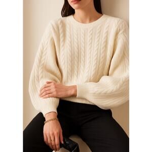 Skull Cashmere Cableknit Sweater Ribbed Crew Neck Merino Wool Size Large Cream