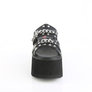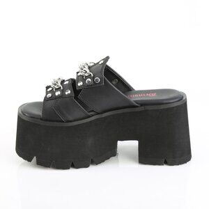3 1/2" Chunky Heel, 2 1/4'' Cut Out Platform Double Strap Slide Sandals. Skull and Crossbones Studs and Metal Chain Adorned Straps. Faux Leather.
