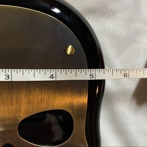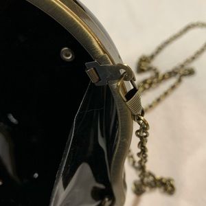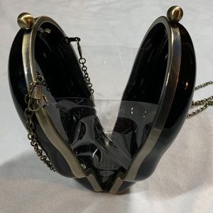Black acrylic clamshell clutch with brass colored metal accents and detachable chain. I got it new. I’ve never used it, but there are a few scratches (pictured)