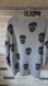 Chic gray cardigan with striking black skulls. Perfect for a bold look. Cozy fabric. V neck. Button front. No holes. One pull shown. No Boundaries. Size M