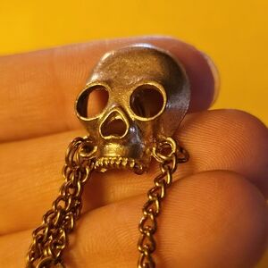 Plated gold skull earring, three pendulum dangles, and a cuff attached by chain.