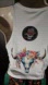This upcycled racerback tank top is handmade by @eclectic_artist. This women’s size Large (8–10) tank is made from a comfortable ribbed knit blend of 95% polyester and 5% elastane, providing stretch and breathability. It features a skull with floral iron-on appliqué on the front and a bull skull with flowers on the back, balancing gothic style with a feminine twist. An embroidered smoking skull patch on the upper back adds extra personality.