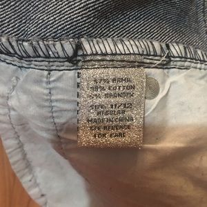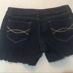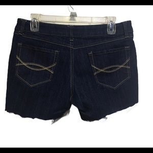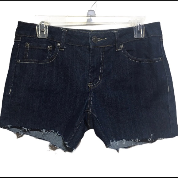 Super cute! Classic indigo blue denim Cut-off look with intentional fraying, Zipper fly with button closure with logo. Three front pockets. Functional blank back pockets.