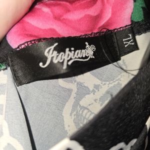 size XL, silky fabric, very cute on. doesn't fit me anymore.