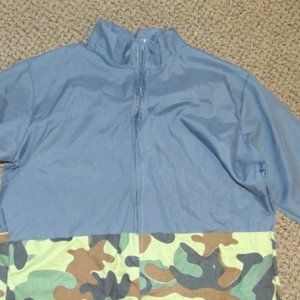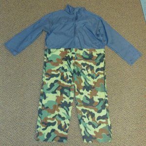 Pants portion of jumpsuit is jungle camouflage print; shirt portion is sold gray