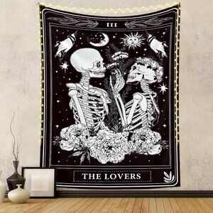 Design: skeleton tapestry is a striking and unique piece of art that blends together themes of life, death, and love in a way that is both eerie and beautiful. At the center of the tapestry, A pair of skeleton lovers who are embracing each other in a moment of passion. Despite their skeletal appearance, these hands are imbued with a sense of love and tenderness, adding a romantic and emotional element to the tapestry.