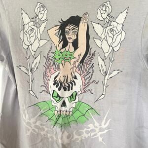 The coolest graphic tee with spider web, tattoo roses, and a woman coming out of a skull