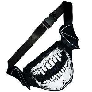 New with tags goth bag. Sink your teeth into this Skull hip pouch! Featuring an adjustable strap and large clip with vegan leather wings and a canvas pouch printed with a white vamp skull print. Measuring approx. 6IN X 10IN X 2IN with two extra zippered compartments, a small one in front and a large one in the back! Adjustable strap extend up to 33 inches. This is not your granny's fanny pack! Great for travel!