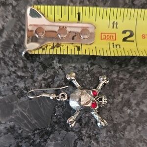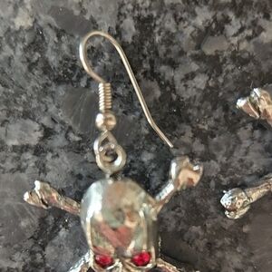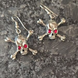 Silver skull and crossbones earrings with striking red bead eyes