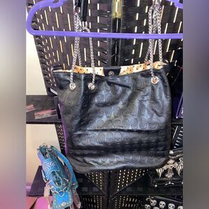 A studded rhinestone Jolly Roger Skull adds signature gothic charm to this easy to carry shoulder bag. It is outfitted with an embossed bag, perfect to drop in or carry on its own.