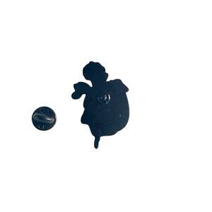 This is a skull and roses enamel pin. The pin features a white skull with black outlines, and two red roses with green leaves emerging from the top of the skull. A black line extends downward from the base of the skull, resembling a stem or drip. The back of the pin is black and shows the pin's clasp.