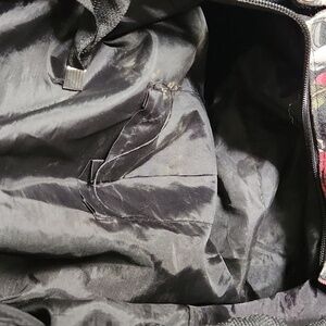 Slouchy hobo bag with a skull and roses pattern. Zip top closure and straps with loop detail. Inside pockets.