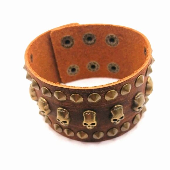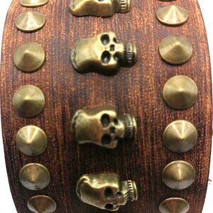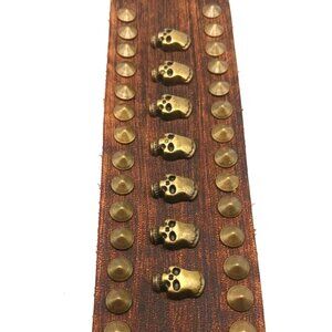 Skull and Spiked Brown Leather Bracelet-New 9 Inches Unisex