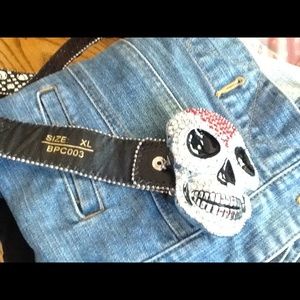 All leather, skull buckle belt, XL, hook/hole style fasten. (denim not included)