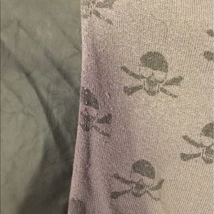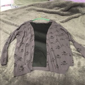 Super cute purplish gray sweater with skulls - leather stripe in the back