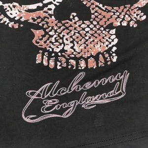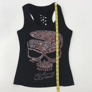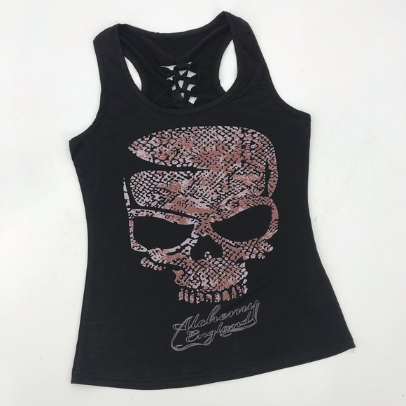 Skull tank top XS. Biker Alchemy England No tagging but probably polyester. Graphics in excellent condition. Preowned, no flaws. See pics for measurements