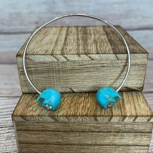 Thin cuff bracelet Jade colored skull accents at the ends Rhinestone eyes Slightly adjustable