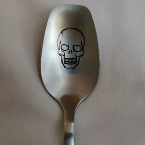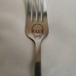 Stainless steel flatware with skulls. Comes with two forks and two spoons. Brand New never used. Both forks and spoons are 7 inches long.