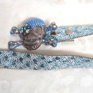 Gorgeous rhinestone and lace with some sequins. I see nothing missing. You can see the holes have been pulled a bit but can't see on the other side