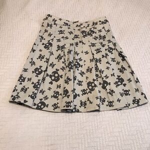 Adorable Skull and Crossbones Pleated Mini! Size 2. Fully lined. Grey w black graphic. Hidden zipper and back button closure. 97% cotton, 3% spandex. Polyester lining. Flat lay L 19”, W 14” approx. #skulls #gasparilla #pleatedminiskirt skulltober!