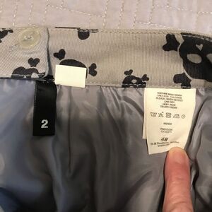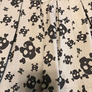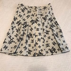 Adorable Skull and Crossbones Pleated Mini! Size 2. Fully lined. Grey w black graphic. Hidden zipper and back button closure. 97% cotton, 3% spandex. Polyester lining. Flat lay L 19”, W 14” approx. #skulls #gasparilla #pleatedminiskirt skulltober!