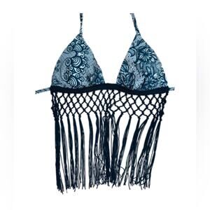 Sky Swim, festival swim top, fringe bikini, rare Sky top, boho beachwear, macramé swimwear, XS bikini, triangle bikini, paisley print, summer essential, sold out Sky bikini, pool party top, resort wear, tassel halter top