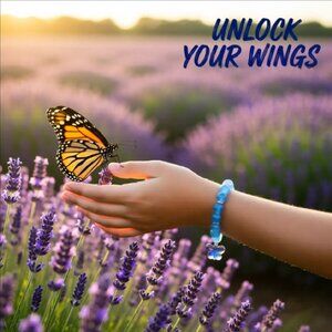 This beaded stretch bracelet: features a slightly larger, iridescent + shimmering butterfly [different from the smaller, darker blue butterflies in other bracelets!]