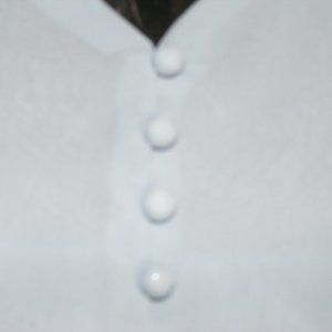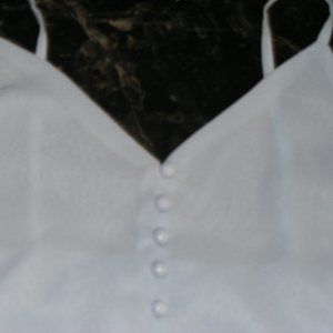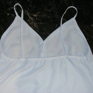 Beautiful sky blue button down top has spaghetti straps great for the summer months.Can be worn under a jacket or sweater.Has elastic in the back of top to give you a very nice fit.Buttons run down entire front of top. Don't worry it comes off and on by pulling it over your head.Do not know the name brand but it is in great condition.It is 35% cotton and 65% polyester. The measurements are Pit to Pit 16"/ Length is 20".Gentle wash or dry clean Hang or low temp dry.