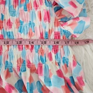 Sky Blue Shirred Yoke Ruffled Abstract Printed Blouse. Stretchy. Size Medium. New without Tags.